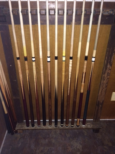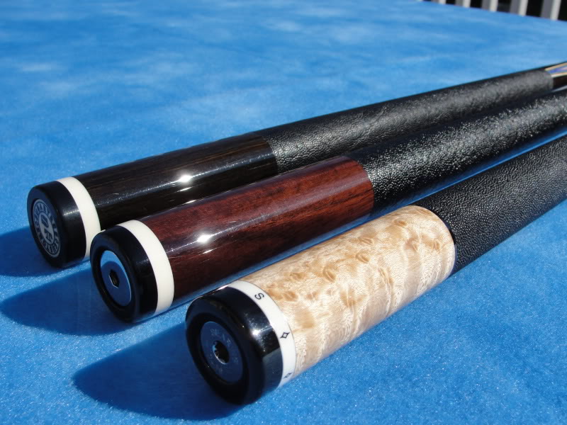 I also have two custom purist-sneakies (OK, they have butt caps, sue me), one made by Scott Gracio the other from a Florida maker whose name I forgot but it is built with a John Davis blank. Cues 4 and 9 in the picture. My other custom full splice cues are more in line with what Mr Hightower was suggesting, a full splice cue with joint collars (and some with butt caps and a few with rings ... so maybe "fancy sneaky" is a good term for them).