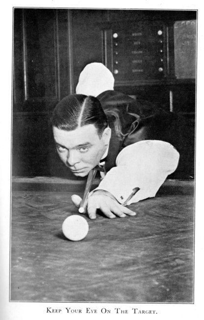 Here is Joe Davis from his 1929 book. It was about billiards rather than snooker, but he was already a pretty good snooker player. He was also more or less blind in his right eye. He was the snooker champion for a few decades.