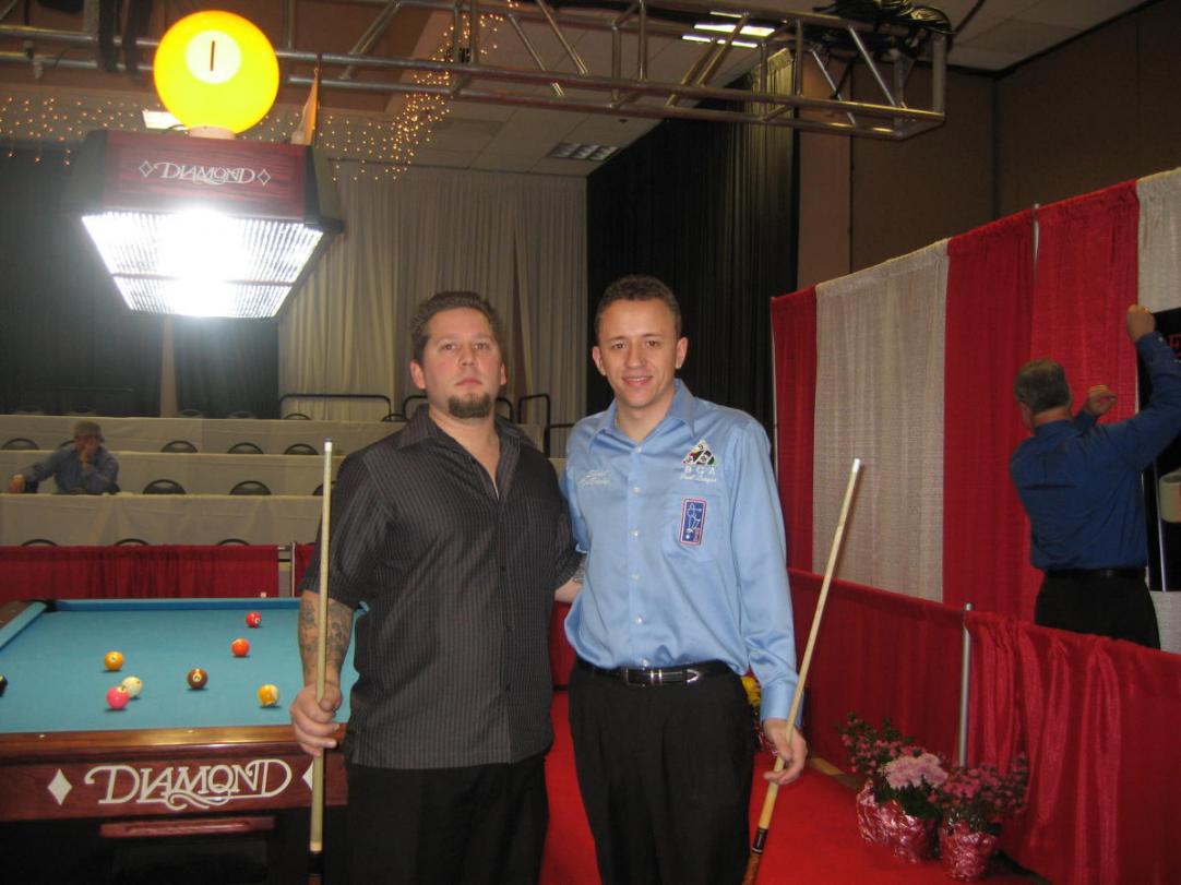 Maybe 4 years ago, my real good buddy, Mike Jackson, and I went to Valley Forge together. He was in the pro 9-ball tourney. Of course, who does he draw first, yep, Shane (see pic below). I will say that Mike played real well but lost either 7-4 or 7-5. He simply couldn't keep up.
