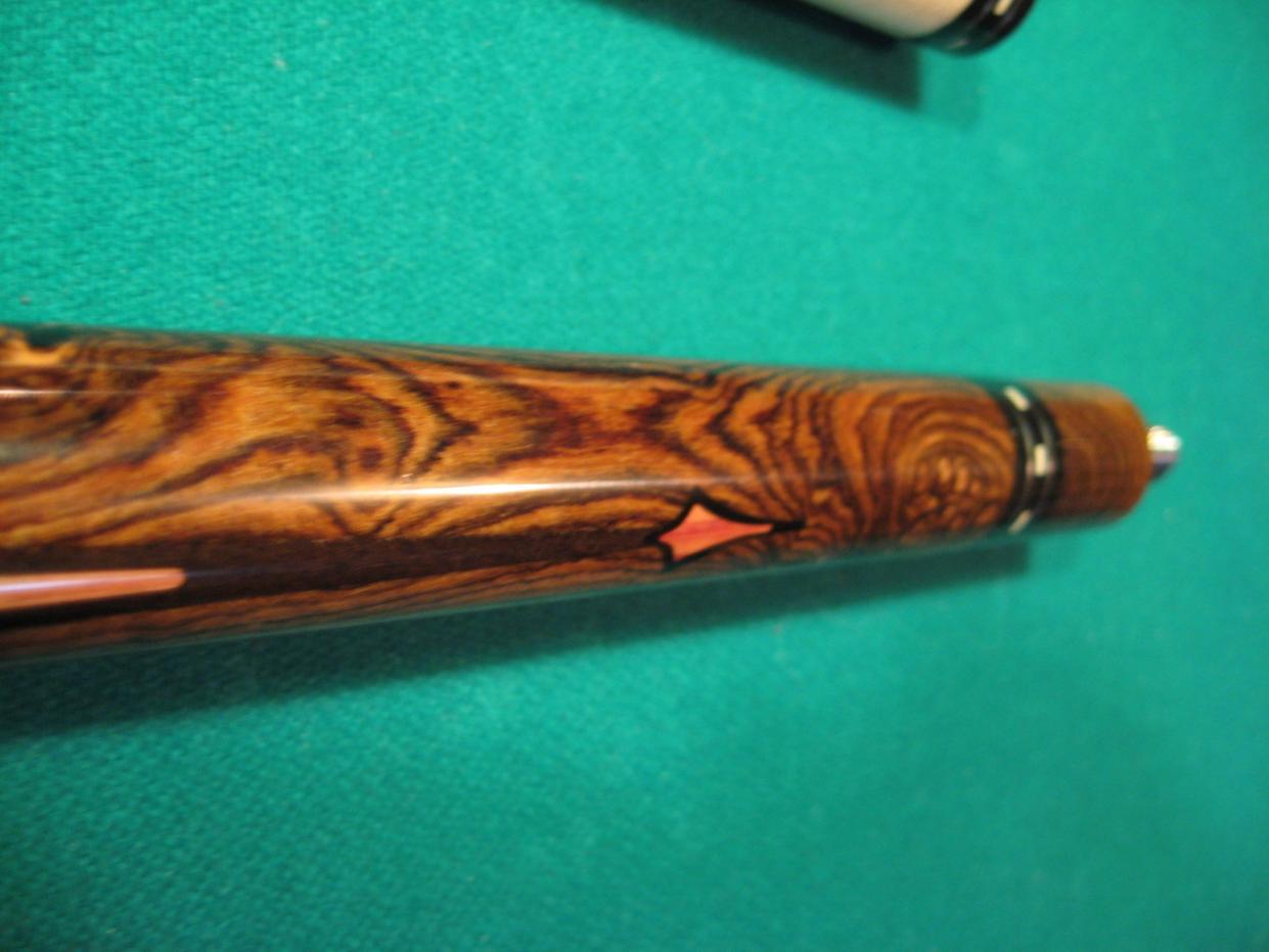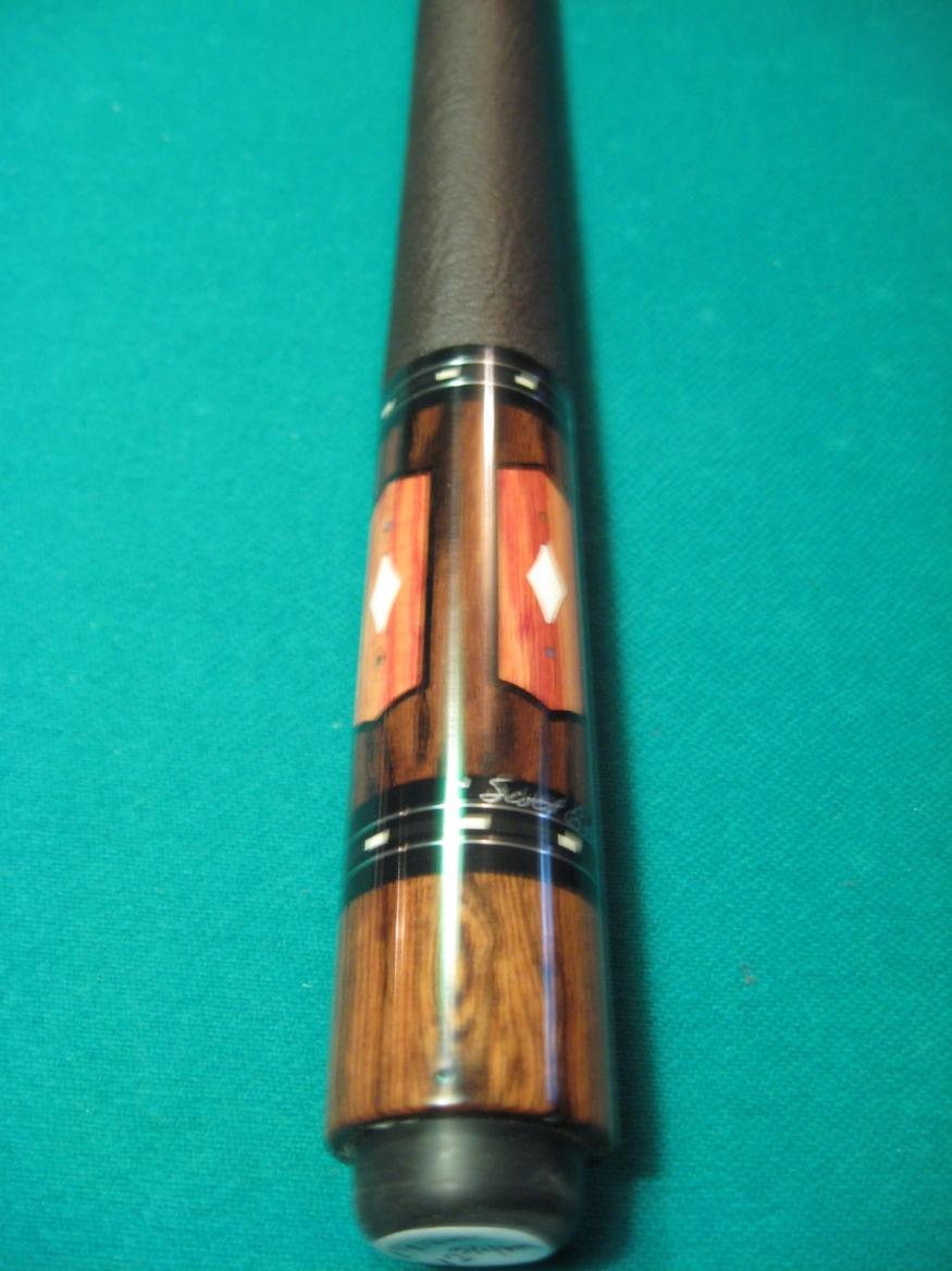 Exotic wood, spear heard big points, nice white stuff diamonds, abolone dots, tri winds in butt sleeve with more white stuff diamonds and abolone dots, stitched collars, awesome textured leather wraps, or irish linen, or can clear coat over wraps. All handmade, great balance points, choice of joint styles, it goes on and on. For $ 500.00, are you kidding me ?? Talk about being getting more cue than your hard earn money is worth, Scott Erwin delivers. I see some of these names on this list selling a sneaky pete for $ 500.00, just imagine if they made something like a Erwin Cue ?? and try to match the hit. All Erwins are mean hitting cues.