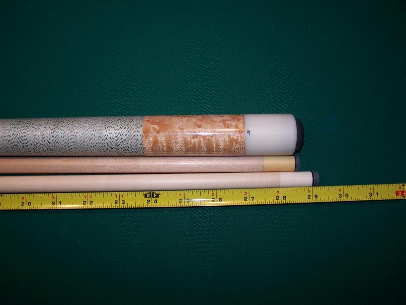 The original shaft has a noticeable wobble, I guesstimate 1/16" or less. The Rat Cues shaft has a very, very slight variation when rolled. I would call it straight, but no surprises. The butt is straight. Mike Webb told me 3 weeks ago that it spun true on the lathe.