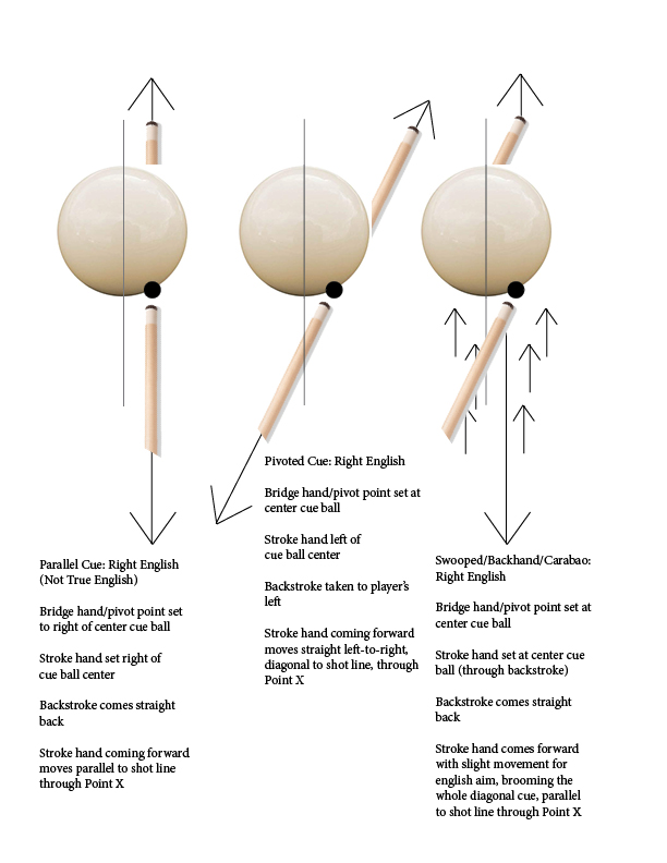 Put another way, I'm comfortable shooting pivot (a diagonal stroke hand movement) or carabao (forward with a bit of deviation) but not brooming a diagonal cue stick with precision.