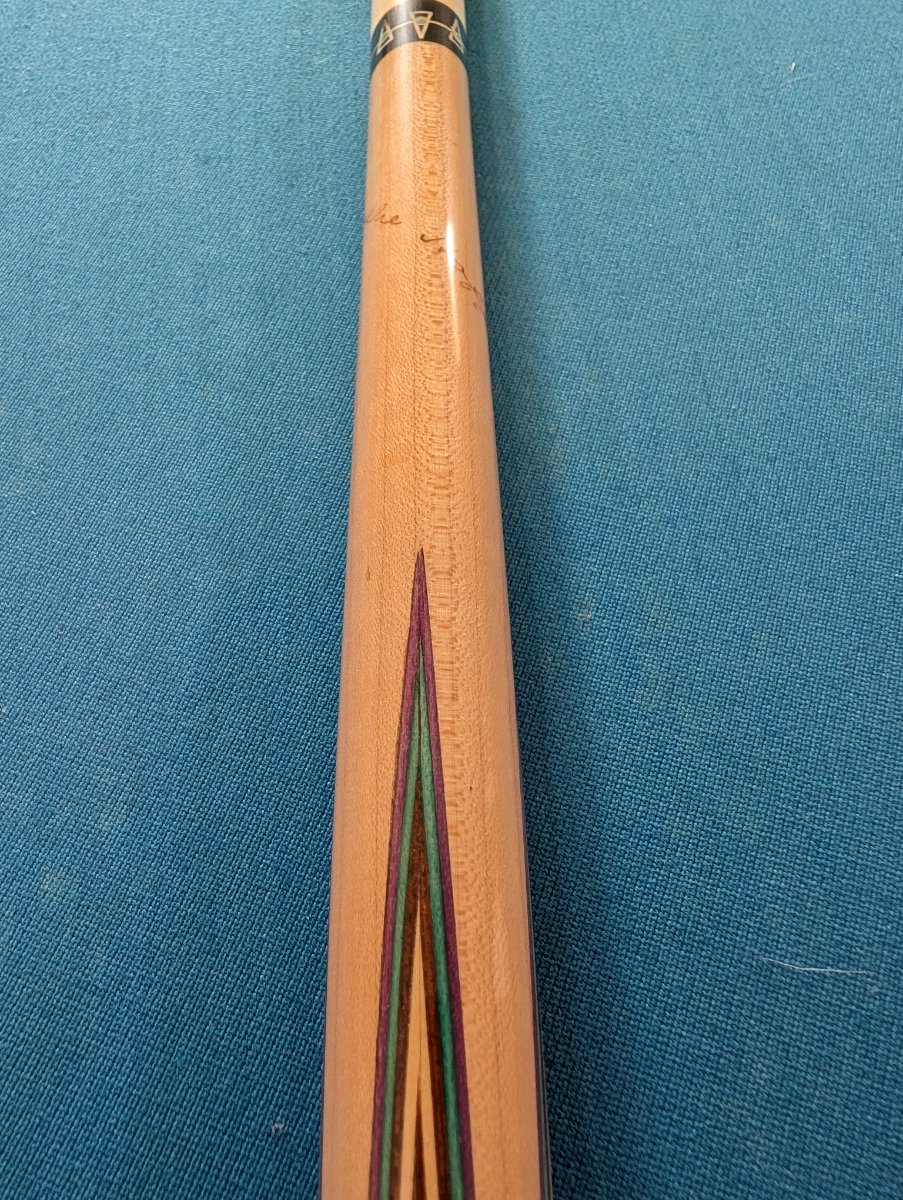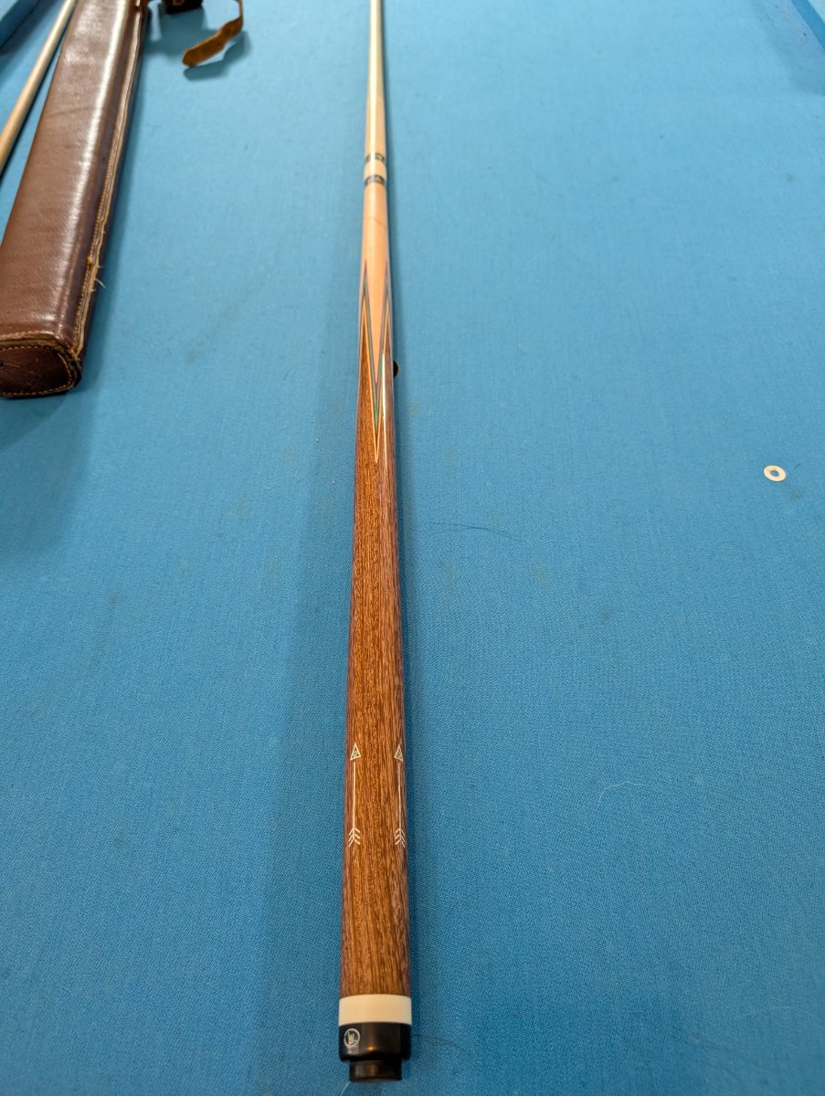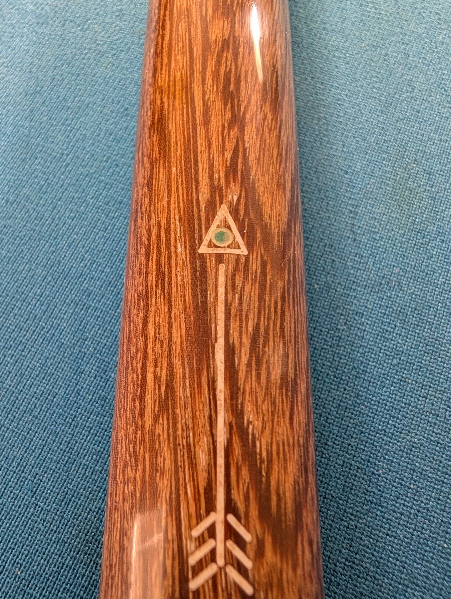 Willie Hoppe the professional war era Cue Conversion, done by By Woody Woodworth who is a well-known cue maker out of Florida and is featured in every billiard Blue book. Custom ring work and arrows on butt of the cue are made from hand pick authentic African Turquoise to give this cue a southwest native theme. This cue is full splice with 5 arrows designed around the but of the cue the white on the joint, ferrule, and hoppe ring are all the good stuff and you can see the light green veins as you turn the cue. This is a one of a kind cue and hits amazing with a milk dud tip installed. 19 oz and come with the original hoppe shaft and original leather case making this war era cue a true collector item, work of art and a daily player. The cue is as straight as the arrows that are on the butt of the cue. Rolls true together and apart. Wont last long