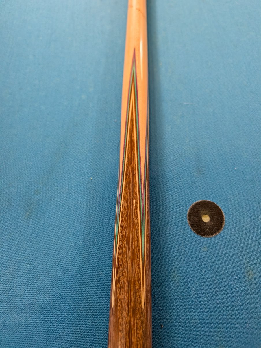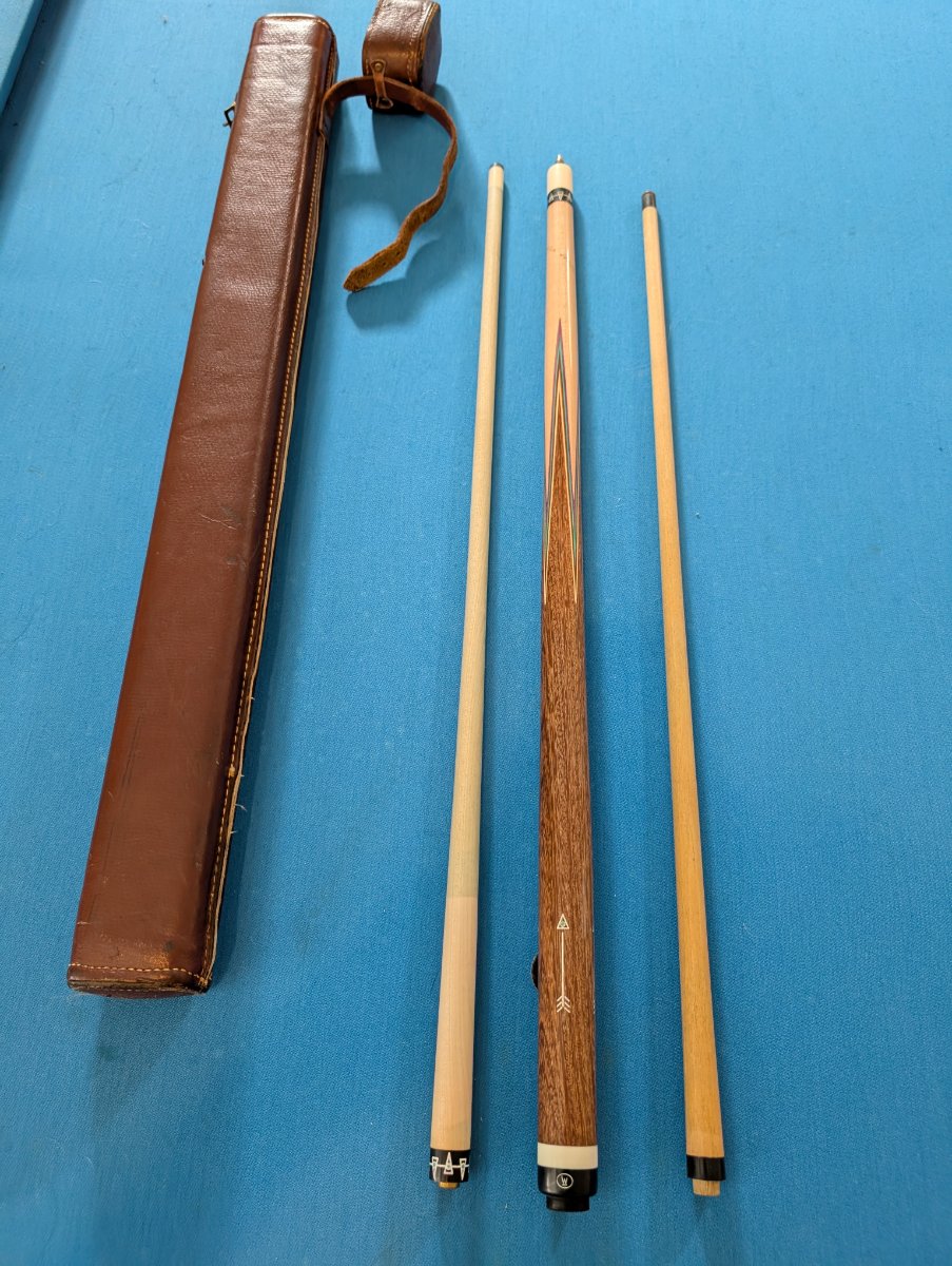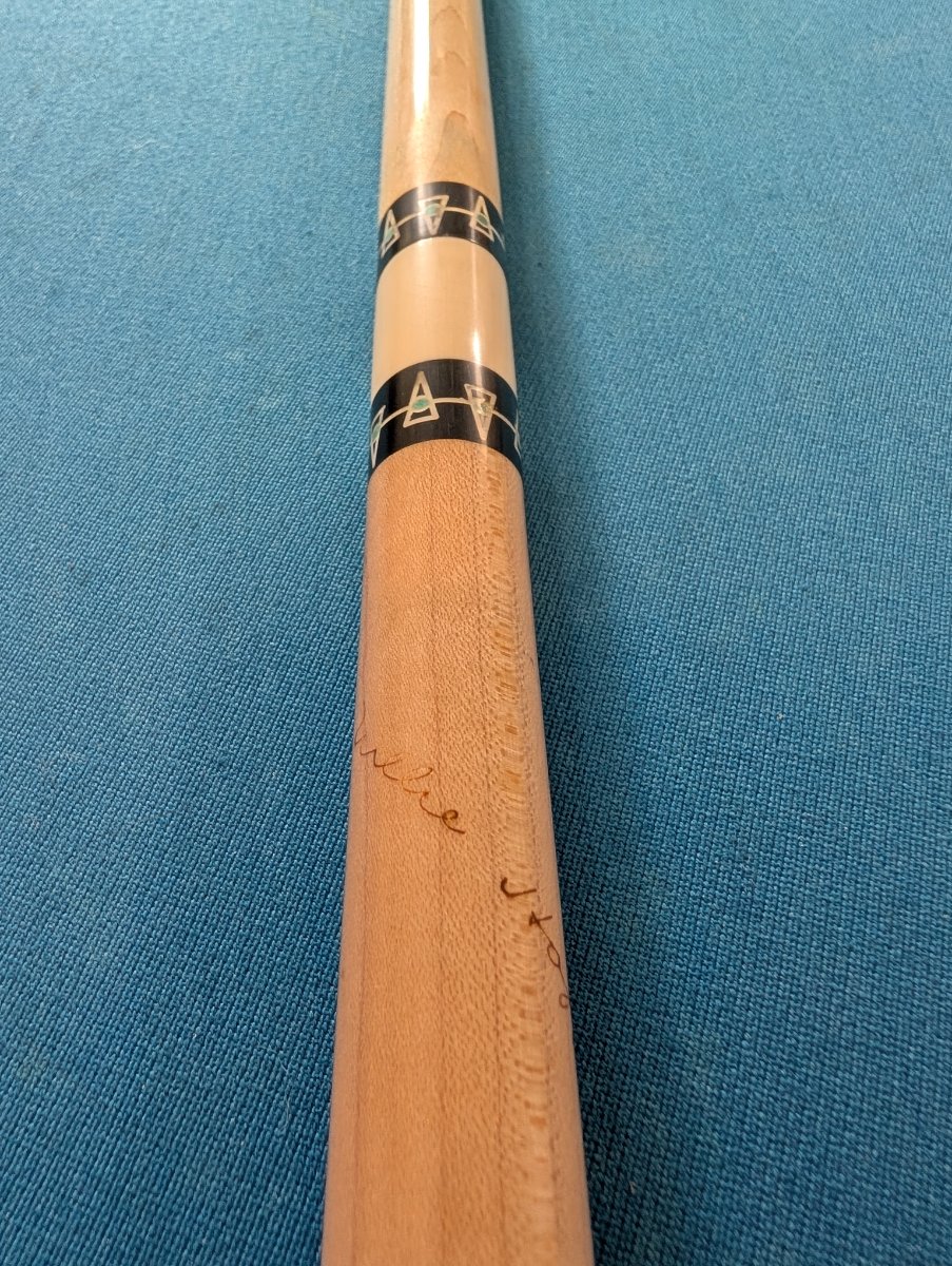 Willie Hoppe the professional war era Cue Conversion, done by By Woody Woodworth who is a well-known cue maker out of Florida and is featured in every billiard Blue book. Custom ring work and arrows on butt of the cue are made from hand pick authentic African Turquoise to give this cue a southwest native theme. This cue is full splice with 5 arrows designed around the but of the cue the white on the joint, ferrule, and hoppe ring are all the good stuff and you can see the light green veins as you turn the cue. This is a one of a kind cue and hits amazing with a milk dud tip installed. 19 oz and come with the original hoppe shaft and original leather case making this war era cue a true collector item, work of art and a daily player. The cue is as straight as the arrows that are on the butt of the cue. Rolls true together and apart. Wont last long