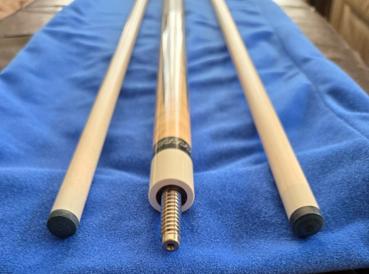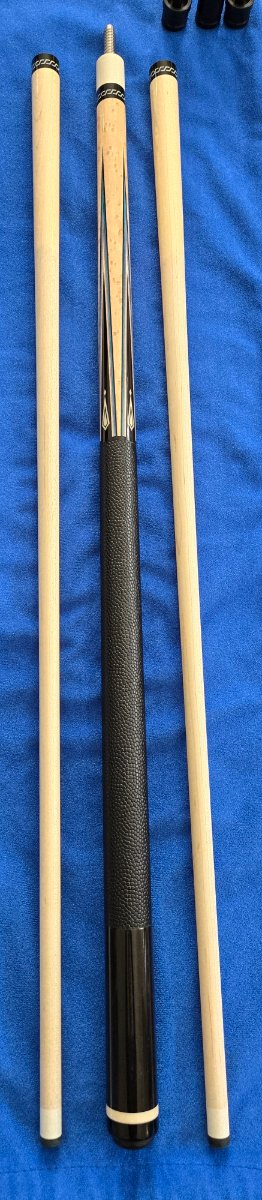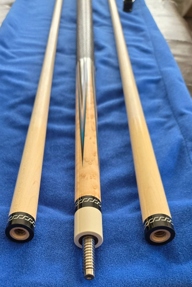 Cored with purpleheart, this cue hits and plays incredible. Butt and shafts are straight together and apart. Butt has no nicks, dings, scuffs or issues. Shafts have very light chalk staining but are free of any nicks or dents. Tips are original.