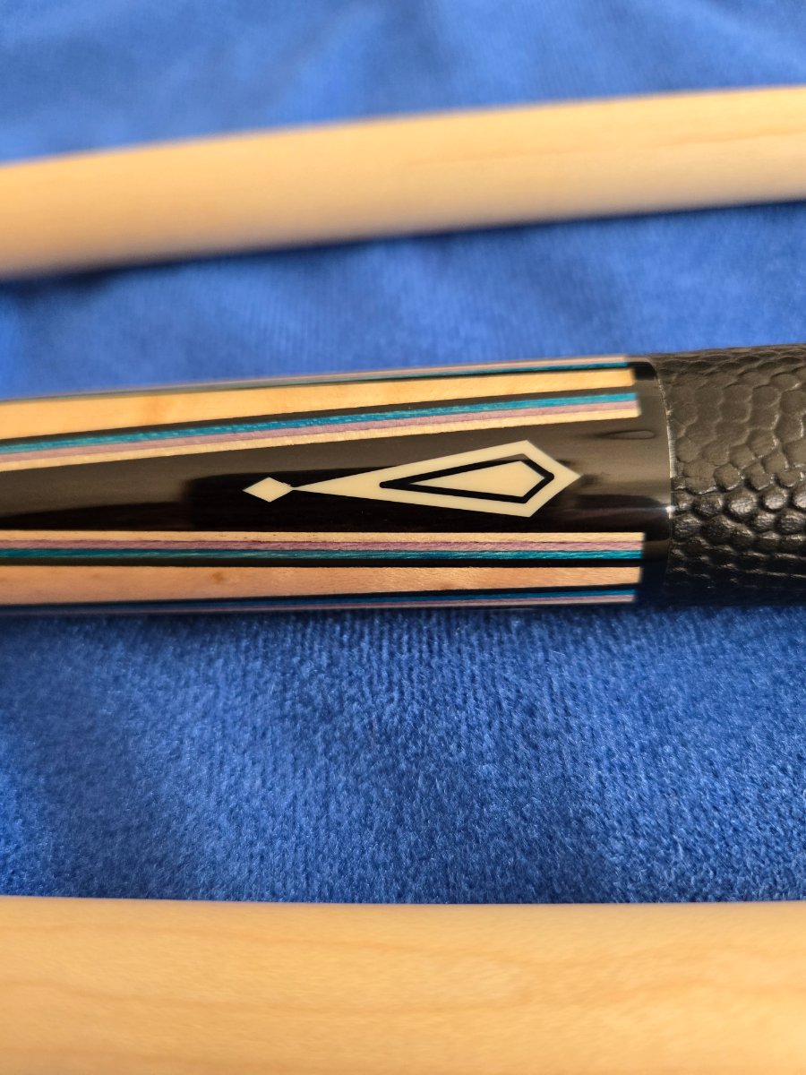 2024 Eddie Cohen Hoppe with Ebony Points and Black, Blue, Violet and Natural veneers into Highly Figured Birds-Eye forearm. Spear Head with Diamond Elforyn inlays. Ebony butt sleeve and Elforyn Hoppe Ring. Inlaid "S" Rings at joint. Pebble leather wrap. 19oz. 13mm.