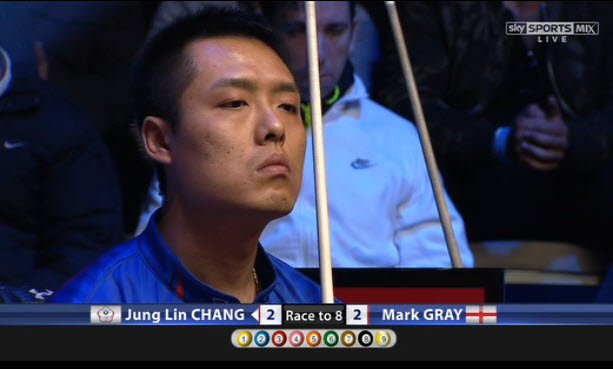 After another run-out by Chang to go up 6-4, Gray sets up this safety and Chang scratches. Gray ball in hand and he moves to 6-5 after making the 3-9 combination.