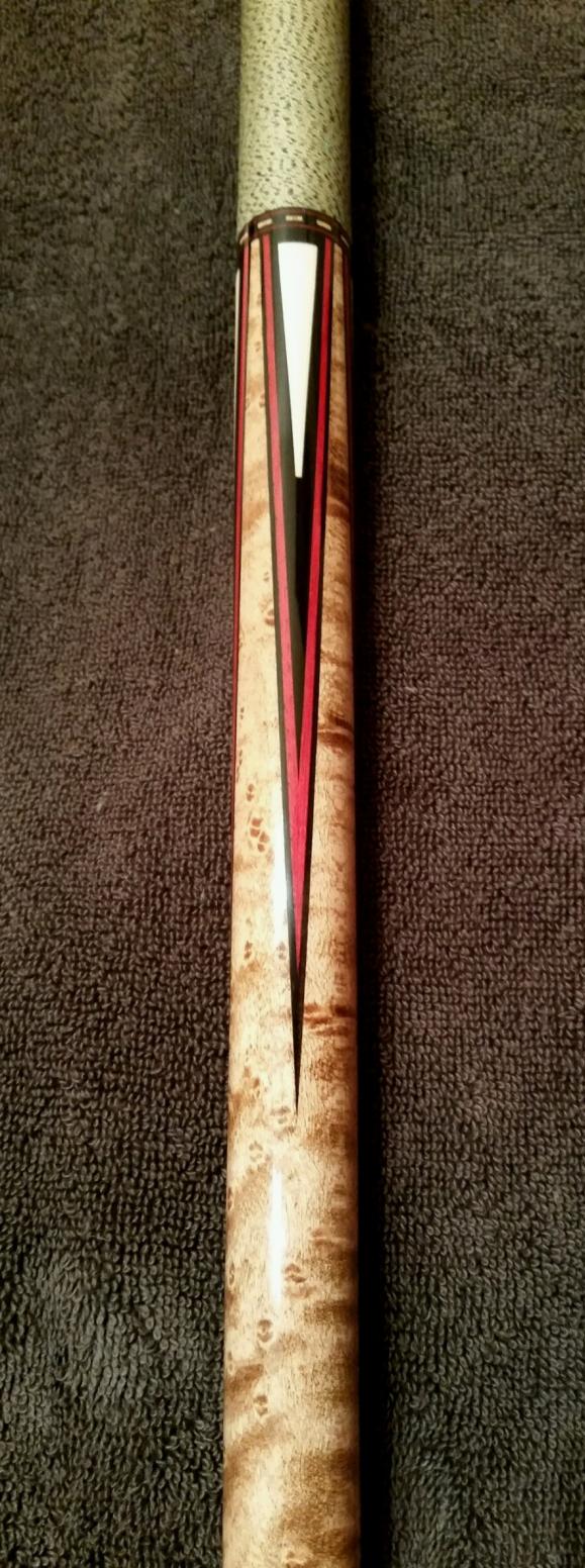 The cue is an earlier inlaid point model made while Bob was still involved in the business. The extent of his involvement of these builds is questionable. The smaller radius of the point tips, inlays, and espescially engraved logo without the "umlauts" (the two little dots above the ö) tell the story.