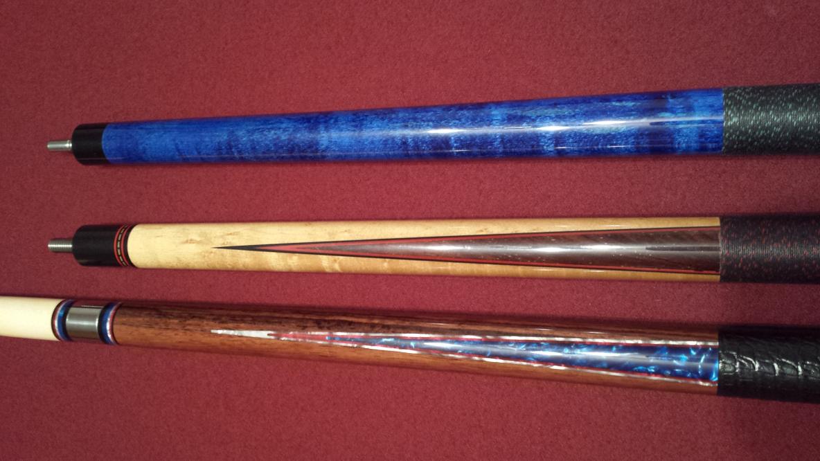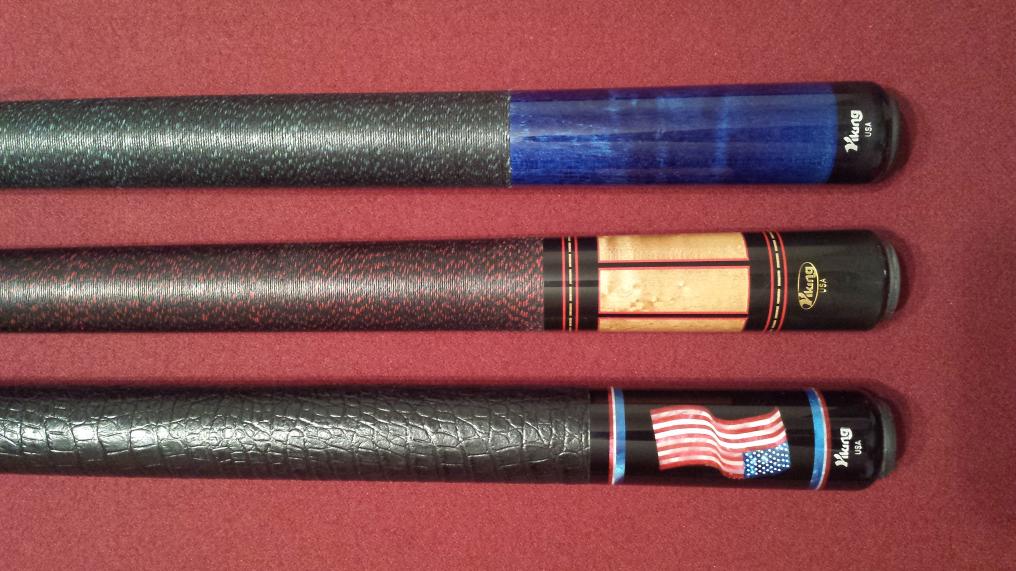 The far left flag cue. Basically brand new. Has ld vikore shaft. Leather wrap. The middle one is an older viking. Really just wanting something without a wrap on it