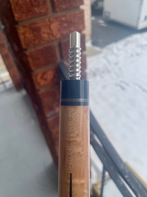 Stunning JOSEY 2016 figured cocobolo, and heavy birds-eye maple full sliceone of one cue with 64 sterling silver dots, cocobolo curl tips in top of points. 2 shafts, Iv$$y joint.