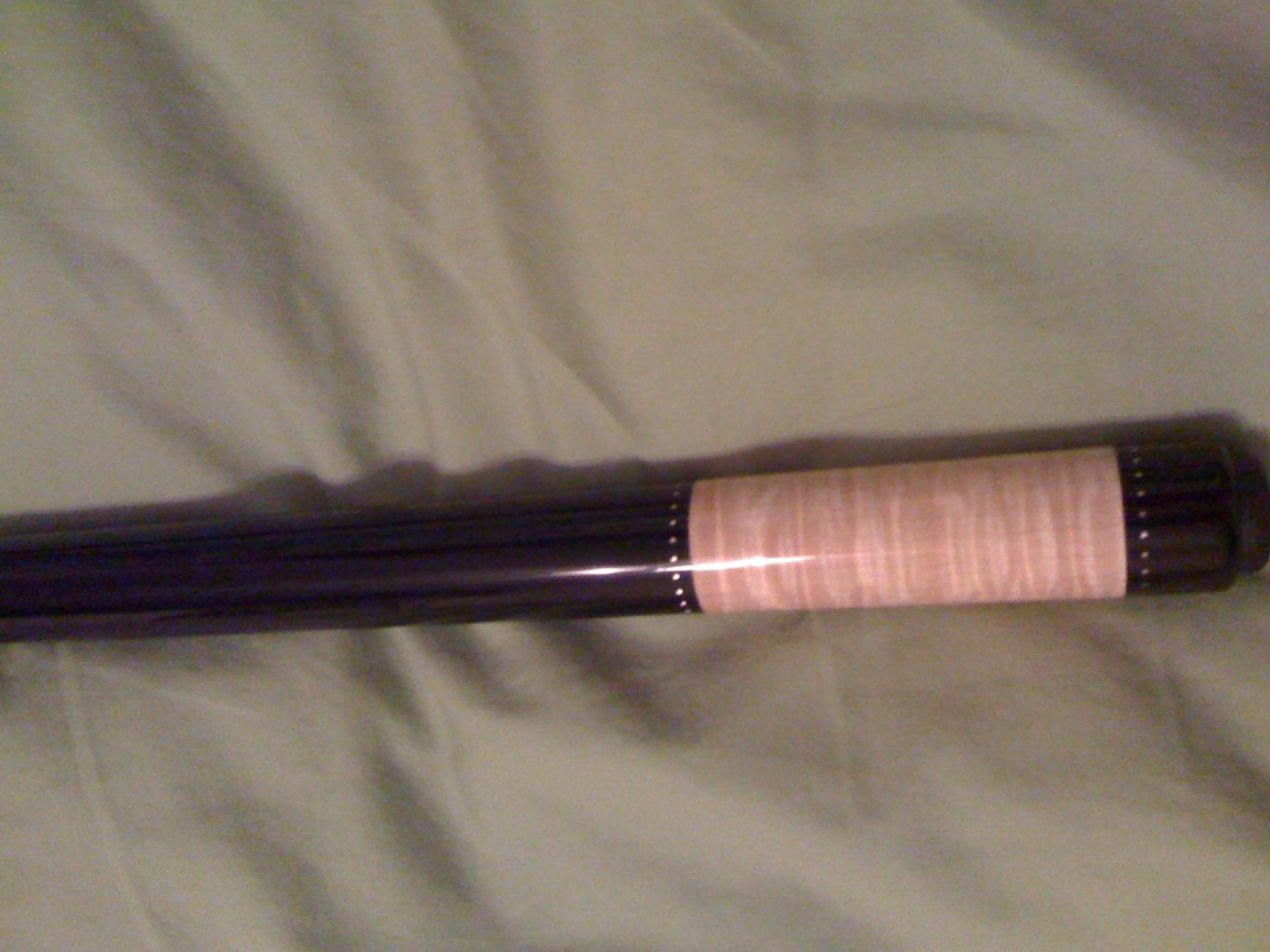 Hi, this is a wrapless Richard Chudy. Four ebony points, ebony handle, curly maple forearm and sleeve, natural and blue veneers outlined in black. Sterling silver rings @ all the locations, G10 black pin. Cue is brand new, received January 2010! Willing to use the escrow service for a smooth deal. Comes with two shafts and joint protectors.$1900 OBO!Shipped and insured to your door. Thanks, Jose