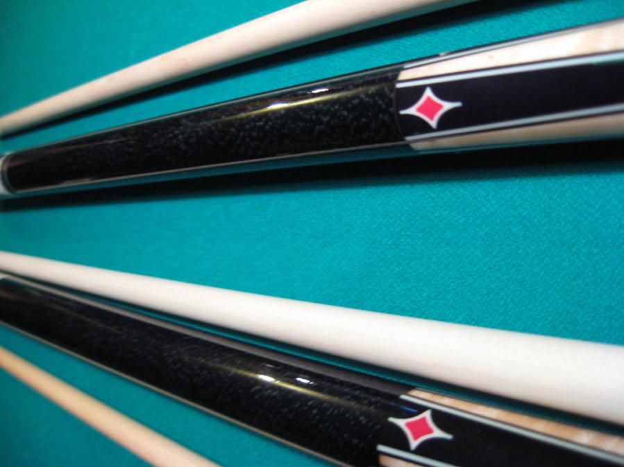 The cue on the left with white butt cap is the EN-9 and the black butt cap is a EN-10 with limb saver. Actual butt cap comes with. Both cues have a clear finish over the wrap making them a no wrap like shooters. The EN-10 does have a G Core Shaft made with throw back collars to match the cue.