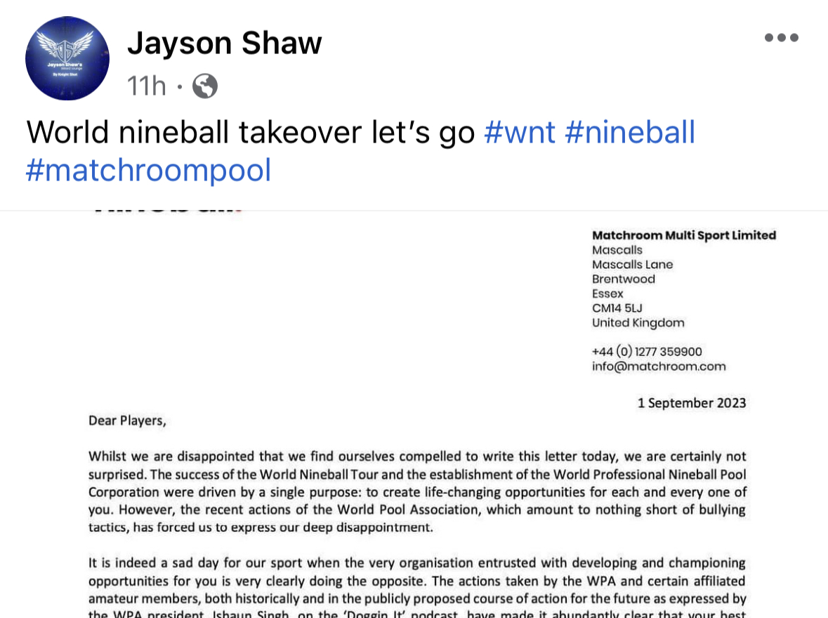 Once again, I reiterate that all of the back-and-forth organizational messaging in print and virtually online is not good for the sport. The communication between all parties involved should be behind closed doors. It does nobody any good for uninformed railbirds, partially informed railbirds, pool enthusiasts, and non-professional pool players to chime in with untoward comments.